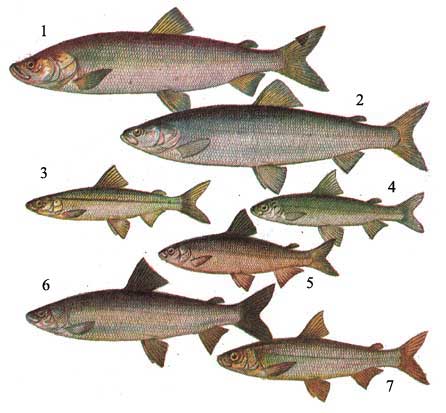 Рис. 10. Лососевые: 1 - нельма (Stenodus leucichthys nelma); 2 - белорыбица (S. leucichthys); 3 - европейская ряпушка (Coregonus albula); 4 - сибирская ряпушка (C. sardinella); 5 - тугун (C. tugun); 6 - омуль (C. autumnalis); 7 - Байкальский омуль (C. a. migratorius).
