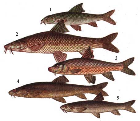 Рис. 20. Карповые: 1 - подуст (Chondrostoma nasus); 2 - пескарь (Gobio gobio); 3 - севанская храмуля (Varicorhinus capoeta sevangi); 4 - закаспийская храмуля (V. c. heratensis); 5 - аральский усач (Barbus brachicephalus).