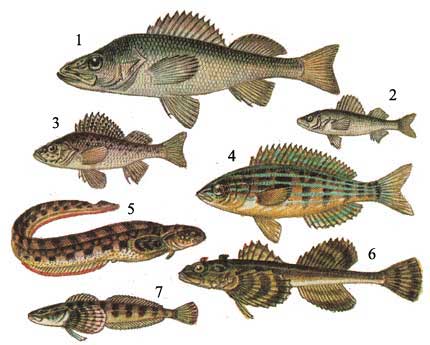 Рис. 31. Окуневые, смаридовые, бельдюговые, подкаменщиковые, байкальские широколобки: 1 - балхашский окунь (Perca schrenki); 2 - азовская перкарина (Percarina demidoffi maeotica); 3 - ерш (Acerina cernua); 4 - смарида (Smaris smaris); 5 - бельдюга (Zoarces viviparus); 6 - ледовитоморская рогатка (Myoxocephalus quadricornis labradoricus); 7 - песчаная широколобка (Cottus kessleri).