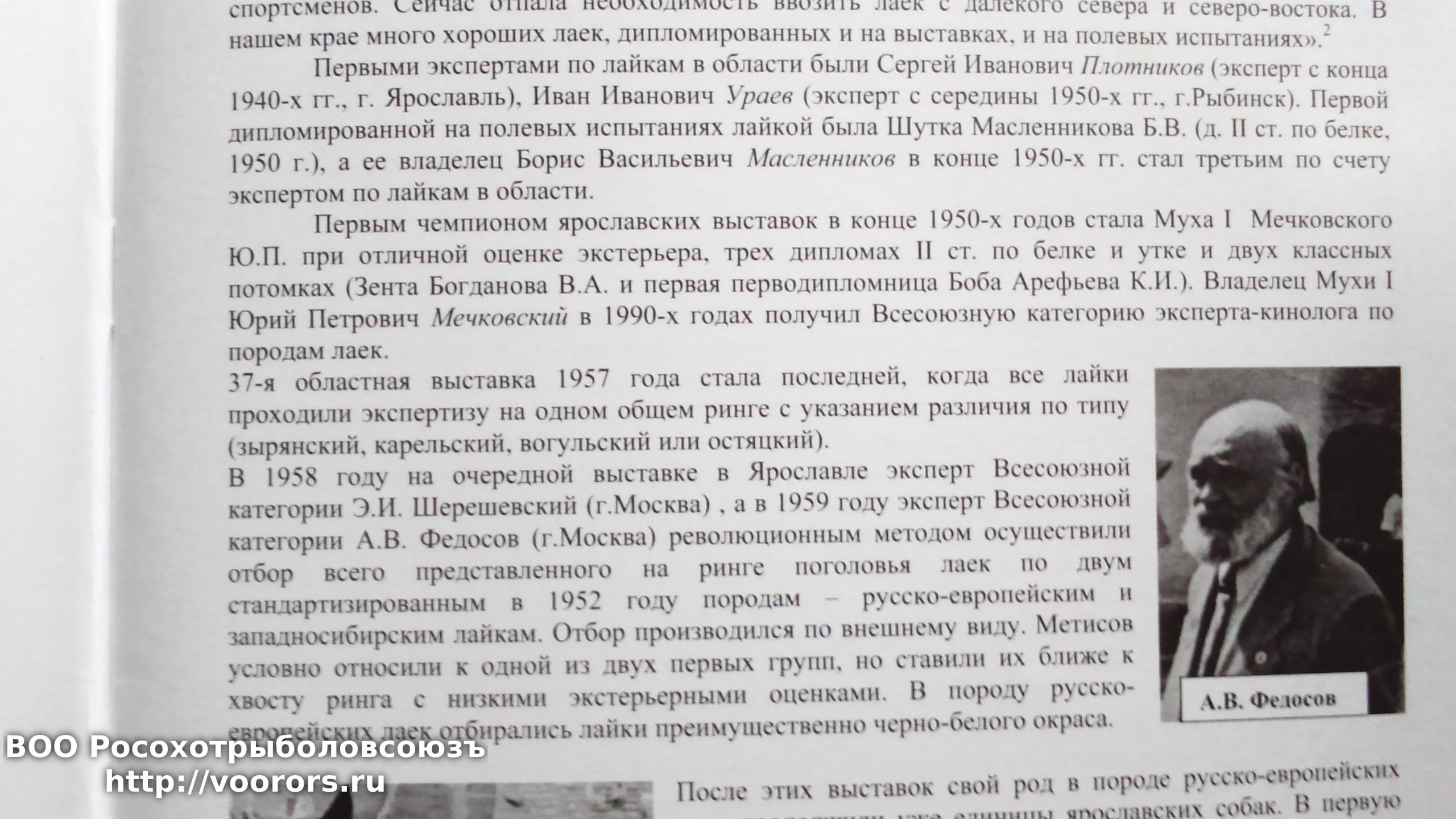 В 1958 году на очередной выставке в Ярославле эксперт Всесоюзной категории Э.И. Шерешевский (г. Москва), а в 1959 году эксперт Всесоюзной категории А.В. Федосов (г. Москва) революционным методом осуществили отбор всего представленного на ринге поголовья лаек по двум стандартизированным в 1952 году породам — русско-европейским и западносибирским лайкам.
