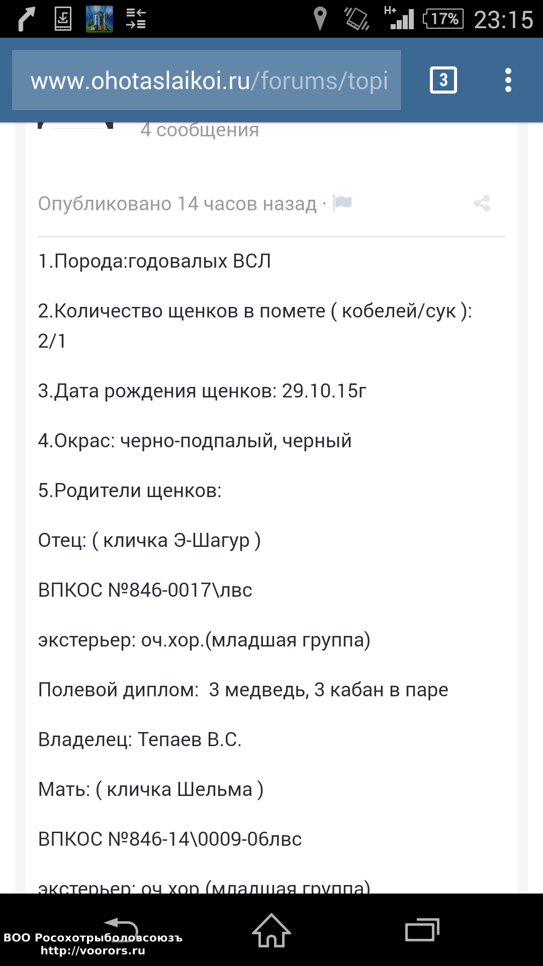Зарегистрирован: 11 янв 2014, 15:33 Сообщения: 301 Откуда: Ленинградская,Волхов Имя: Андрей Город: Волхов,Лен.обл. Собаки: ЛВС Лайма ВПКОС 2000/11(есть чип) ЛВС Тайна (Акай#Ночка) ЛВС Ольхон от Северных собак ЛВС Оять Вяргость от Северных собак Транспорт: X-trail Оружие: ИЖ-58 МАЕ 3-и нарезных ООиР: ЛООиР |