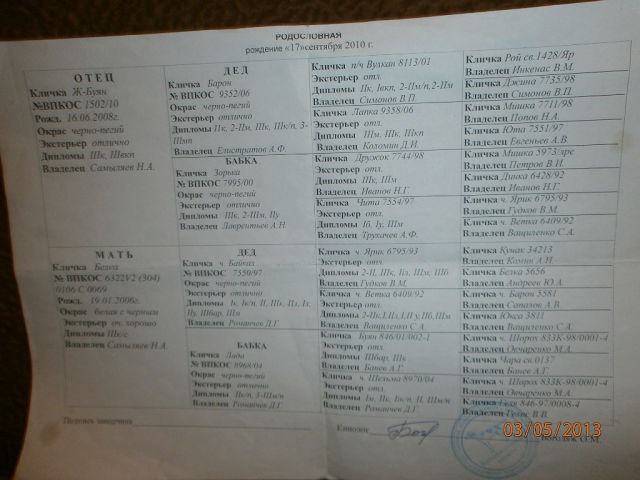 У него только один Ярославец в 4м колене это мой ч.Умка... Кобелёк думаю вам понравится, у него инбридинг на моего ч.Мишку который в типе Шороха, и Никодим вроде как тоже в этом типе... Во всяком случае я смогу увидеть в помёте своих собак до 6го колена, остальные будут в ваших... Ну и себе бы я точно что то от вашей девки оставил... За одно и породнимся...
