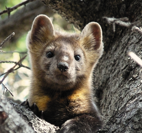 Но внезапно подрост закончился, и нас буквально оглушило собачьими эмоциями. Все три сучки сидели под тонкой сухой пихтушкой, высотой 5-6 метров и совершенно голой. На ее вершинке, уцепившись всеми четырьмя лапами, раскачивался соболек и ошалело таращился на собак.