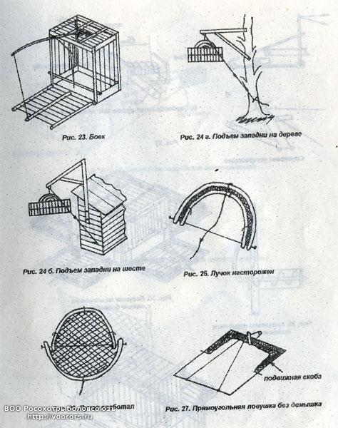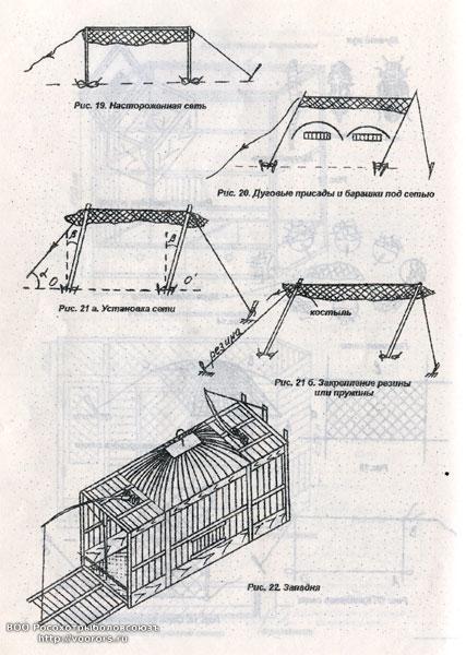 Во-вторых, и это впервые предложено и использовано нами, можно, не разворачивая сетки, приспособить к барашку с ловчим жаворонком автоматические сетчатые хлопушки-бойки подобно тому, как это делается в западне.
