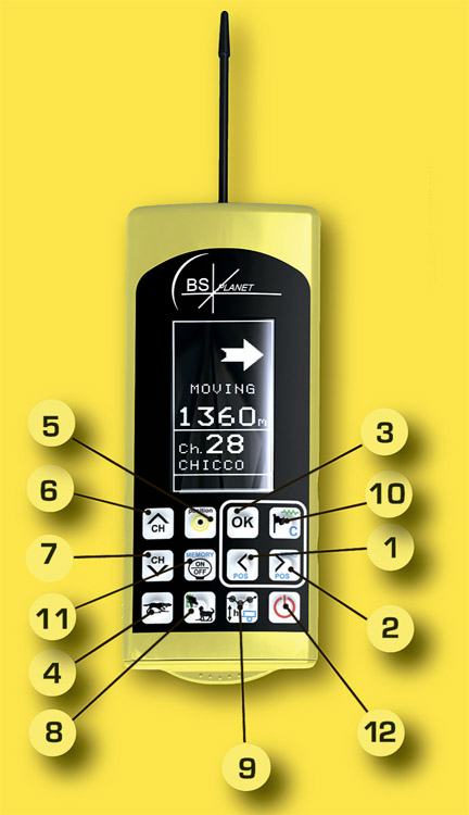 10. С помощью нажатия этой кнопки вы можете отметить до 100 опорных точек на местности. Эта функция очень удобна при выслеживании раненой дичи или чтобы быстрее найти путь к машине после поиска собаки на незнакомой местности. Если нажать и держать эту кнопку на ошейник будет послана вибрация и/или раздражающий звук и/или электрический импульс (расстояние до 20 км на открытой местности).