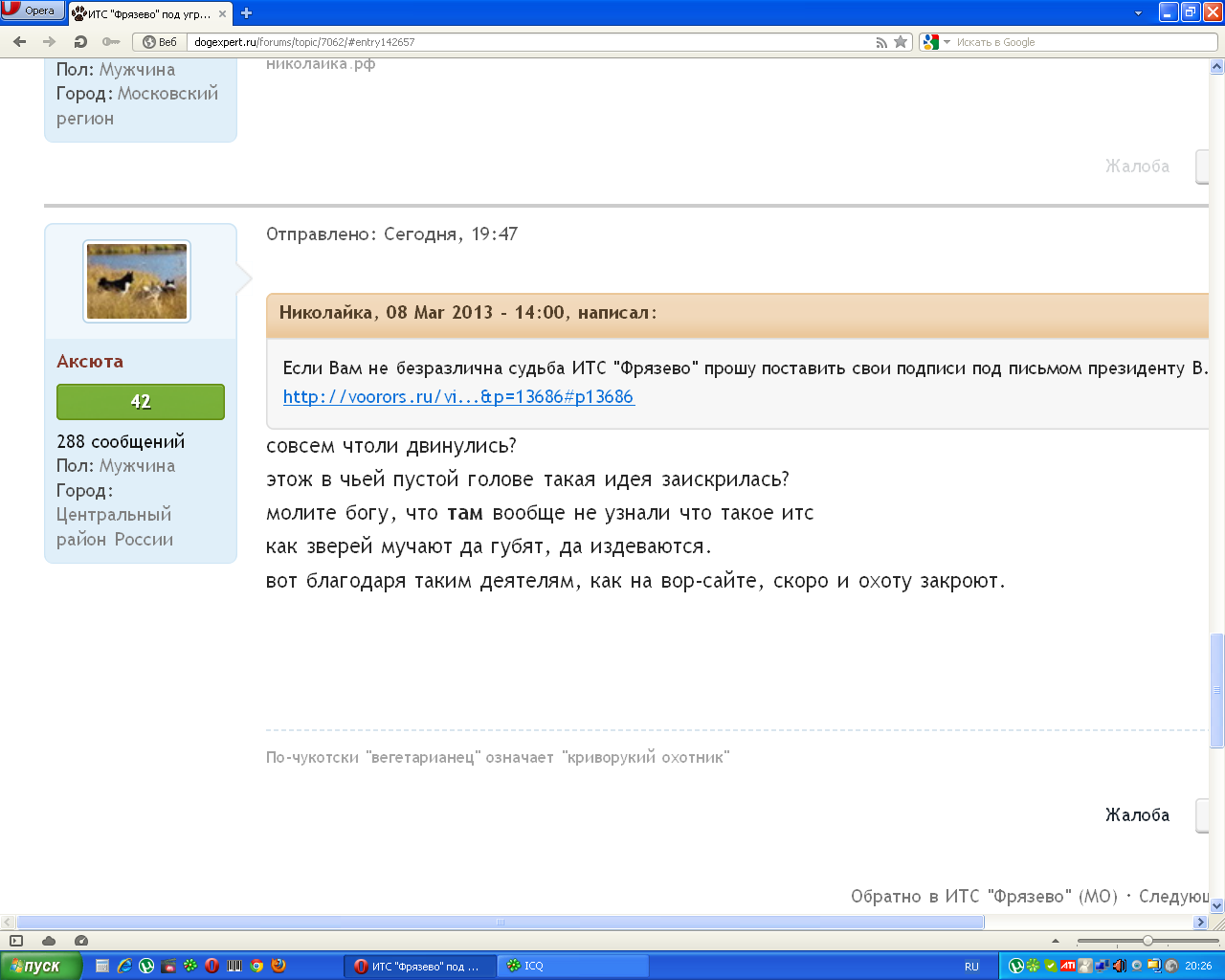 Зарегистрирован: 08 мар 2013, 16:13 Сообщения: 37 Откуда: Москва Имя: Александра Город: Москва Собаки: Ягдтерьеры Транспорт: Mitsubishi Outlander Оружие: Собаки зверовые. ООиР: Кольчугинское ООиР |