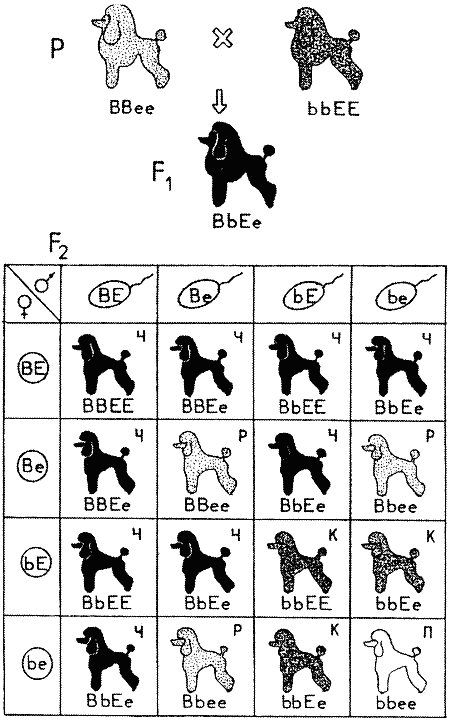 Рис. 18. Комплементарное взаимодействие генов, определяющих окраску собак: соотношение — 9 черных (Ч): 3 коричневых (К): 3 рыжих (Р): 1 палевая (П)Гены локуса