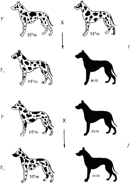 Рис. 20. Наследование мраморности типа «арлекин» у догов. Ген М h (фактор Мерля) — доминантный с рецессивным летальным действием: 1 — скрещивание мраморных догов между собой; 2 — анализирующее скрещиваниеФактор Мерля относится к категории доминантных летальных генов, которых значительно меньше, чем рецессивных. При желании его носителей легко изъять из разведения, так как они имеют характерный фенотип. Одни летальные гены обуславливают крупные аномалии, другие — нарушения физиологических процессов. Пути губительного воздействия большинства летальных генов не ясны. Таких генов может существовать сколь угодно много. Показано, что каждый человек является носителем в среднем 4–9 «вредных» или летальных генов. Аналогичных результатов можно ждать и по собакам. Известны летальные гены, которые при проявлении в эмбриональном состоянии, опасны и для жизни беременной суки, например, при наследственной контрактуре мышц плода, вследствие чего сука не может разродиться.