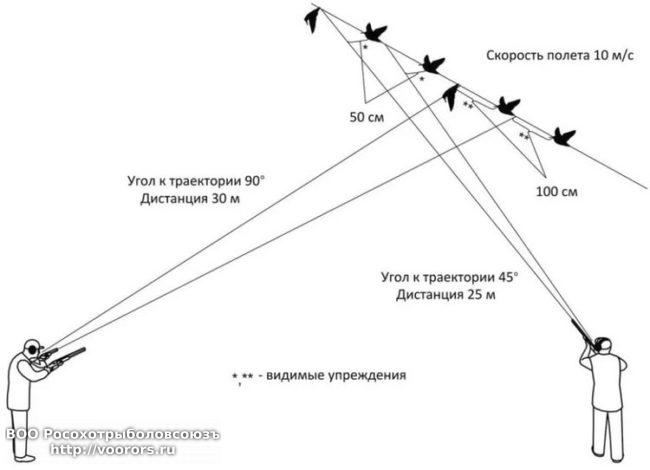 Упреждение при стрельбеСтреляют по вальдшнепу одновременно вскидывая ствол и совершая плавную поводку корпусом. Скорость его полета колеблется от 10 до 17 метров в секунду. Поэтому упреждение стоит брать порядка 50 – 70см, это приблизительно полтора – два корпуса.